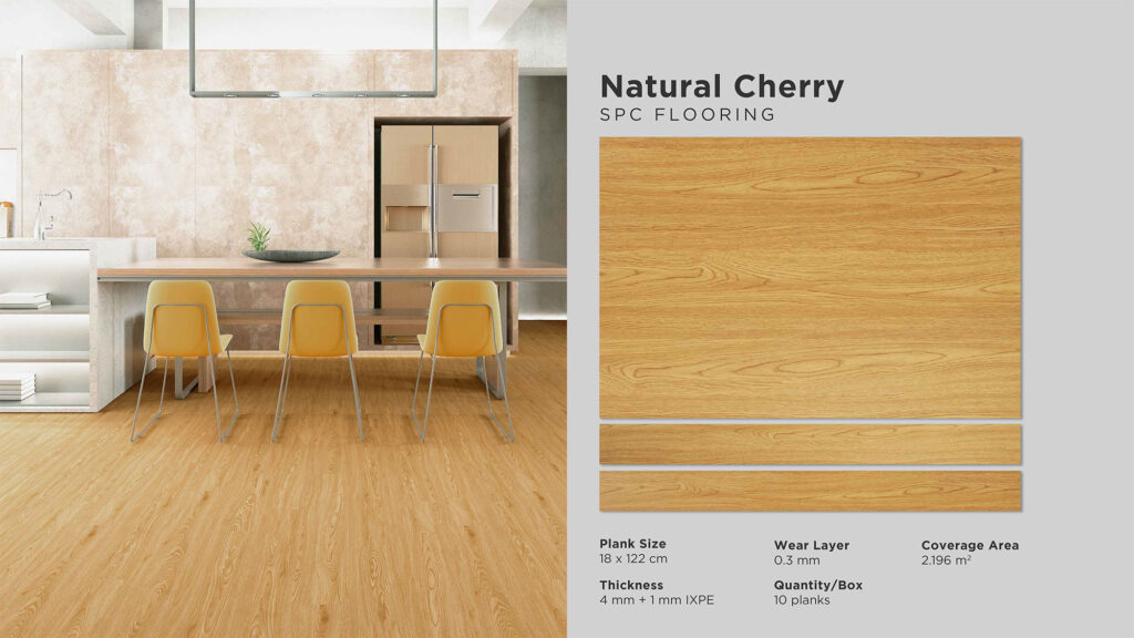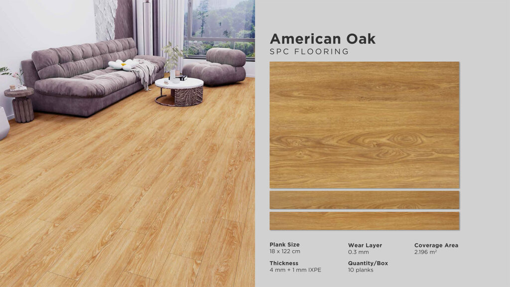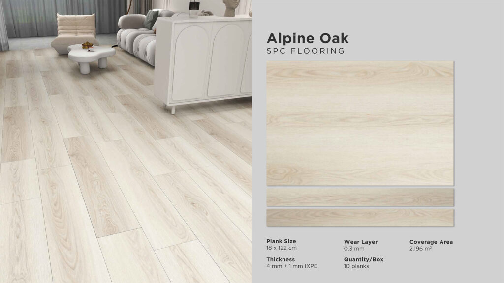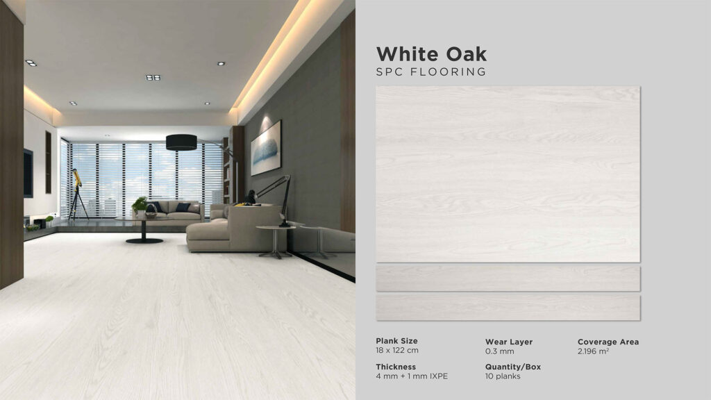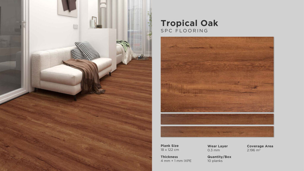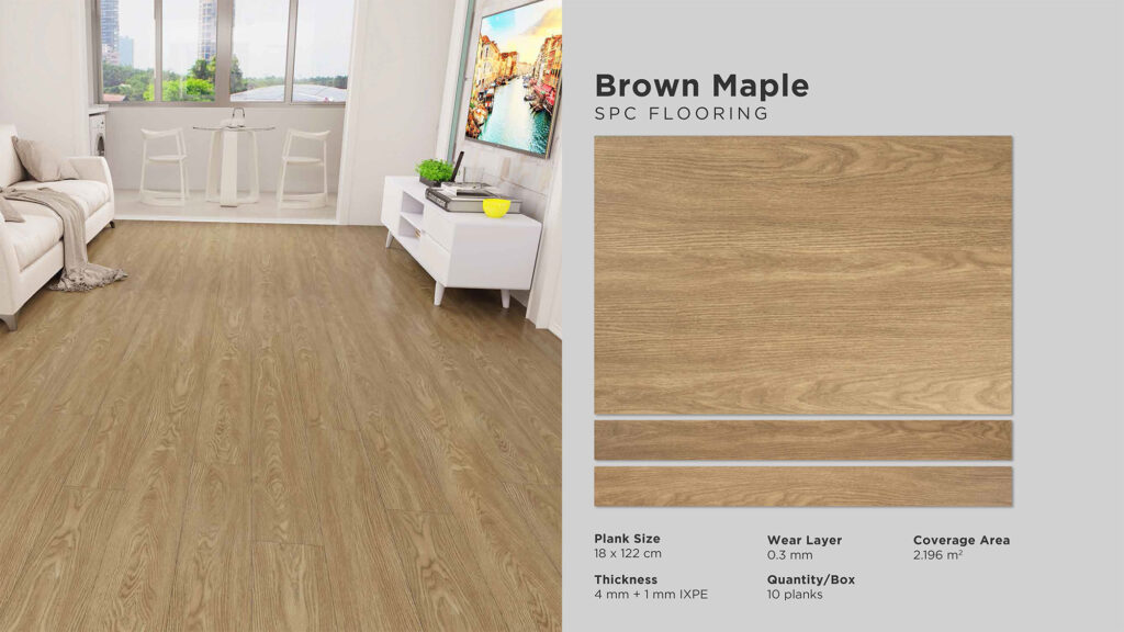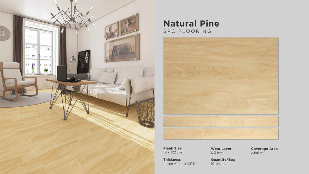 Wear Layer : 0,3 mm | Thickness : 5 mm Size : 180 mm x 1220 mm | Cover Area : 2,196 m2 Quantity / Box : 10 pcs