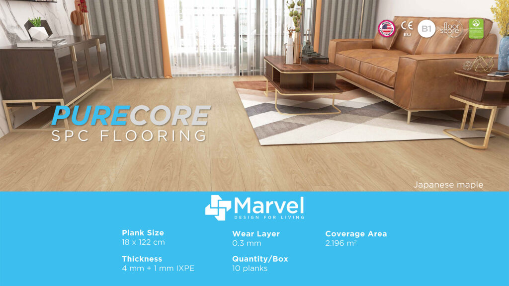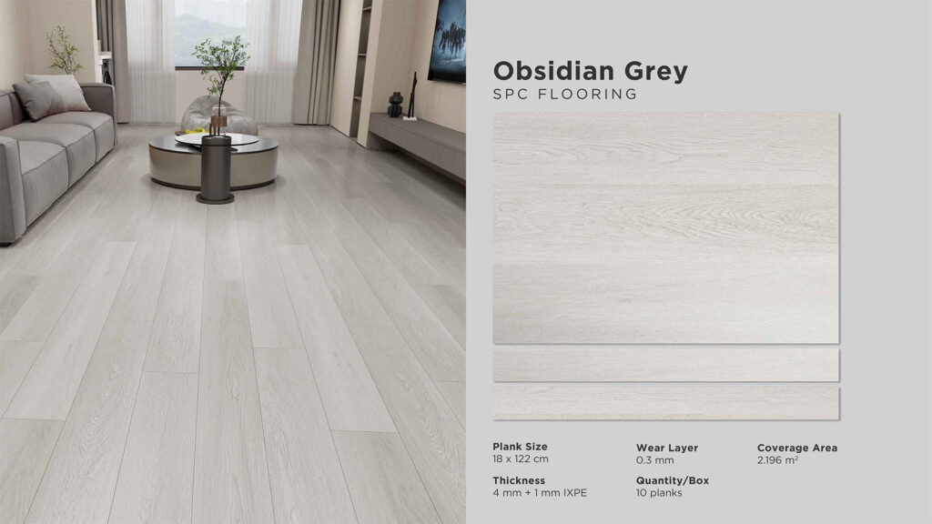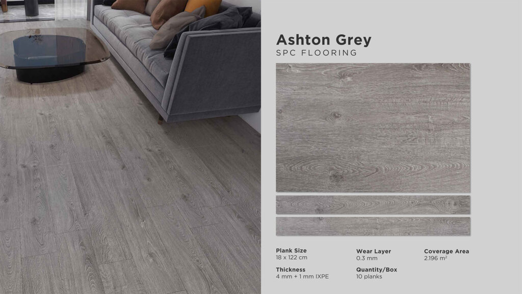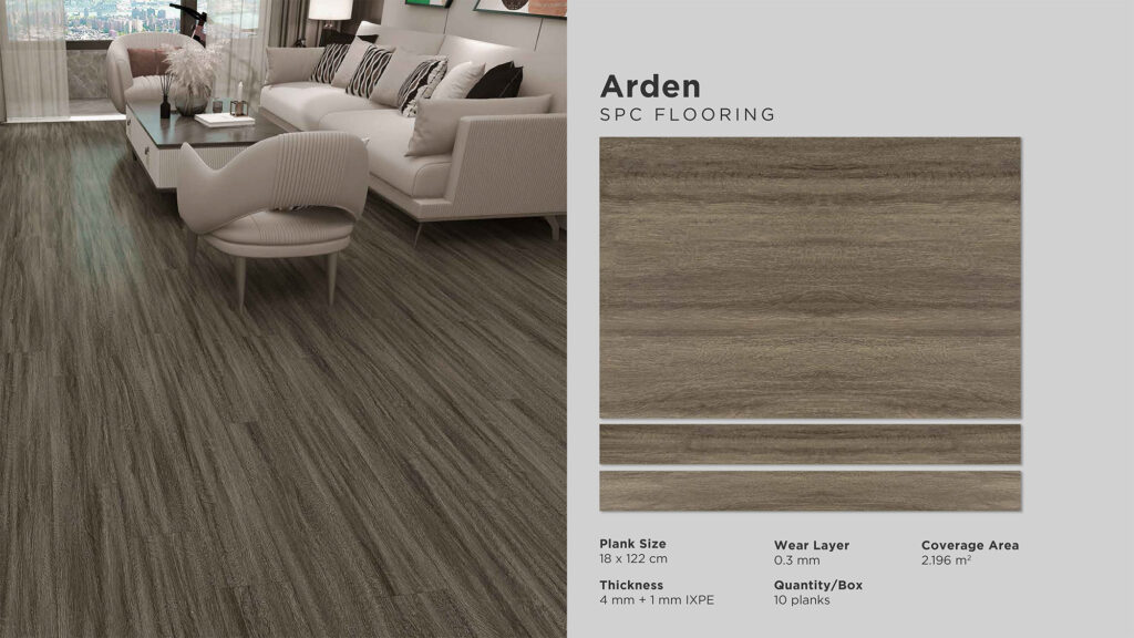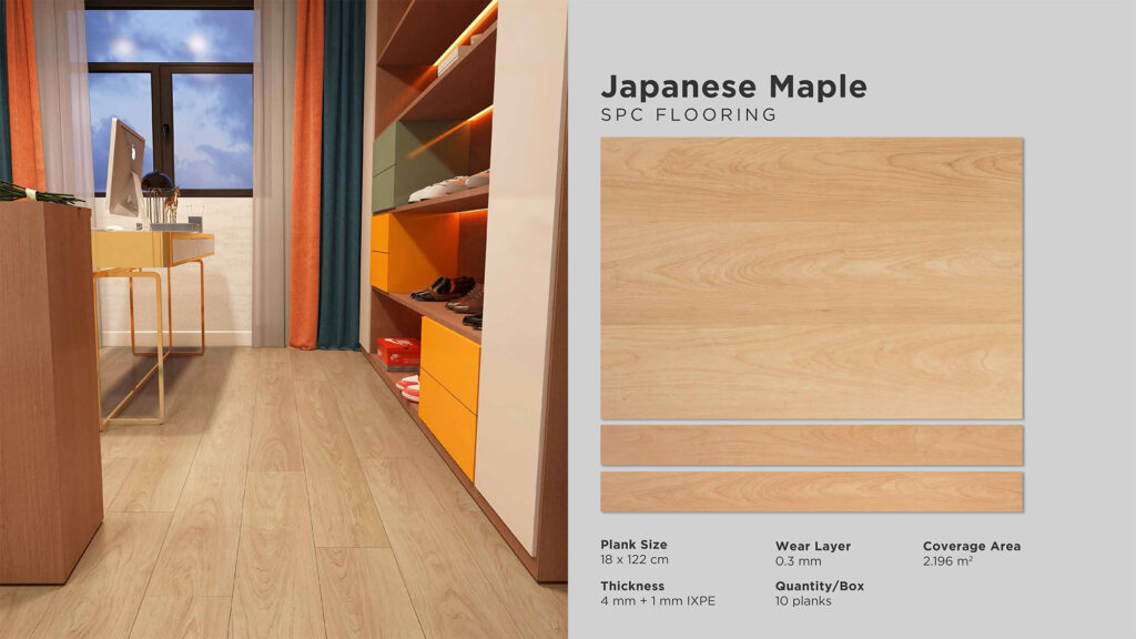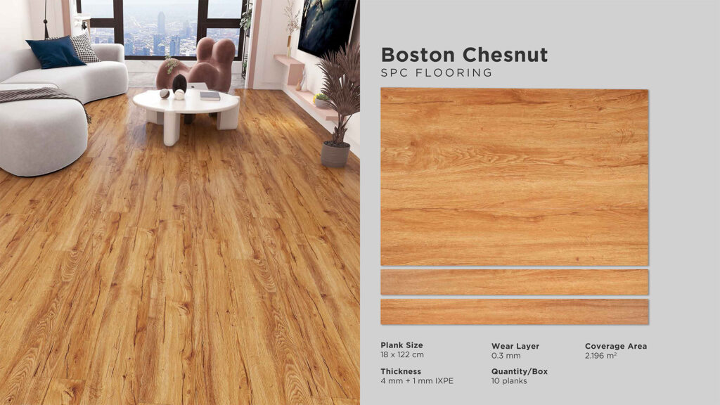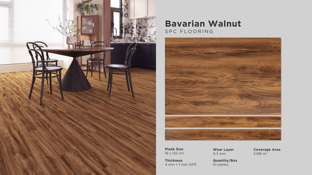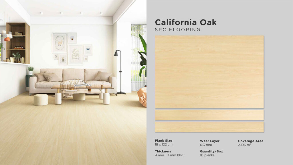 Wear Layer : 0,3 mm | Thickness : 5 mm Size : 180 mm x 1220 mm | Cover Area : 2,196 m2 Quantity / Box : 10 pcs