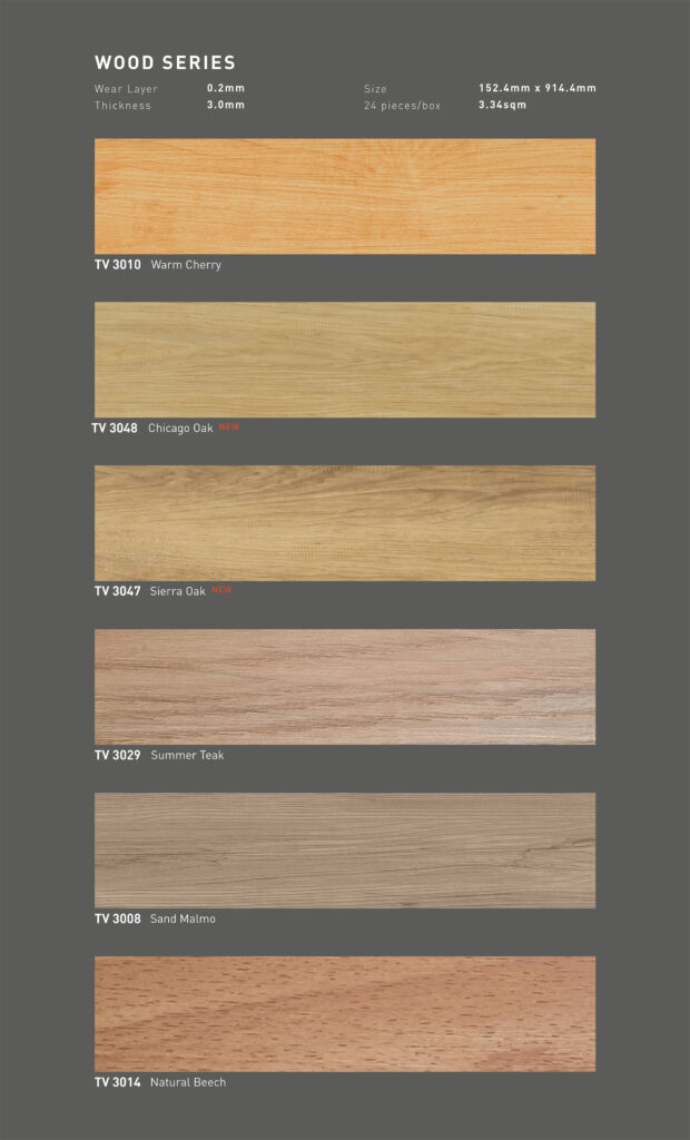 Wear Layer : 0,2 mm | Thickness : 3 mm Size : 152,4 mm x 914,4 mm | Cover Area : 3,34 m2