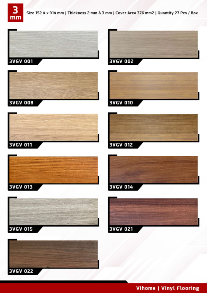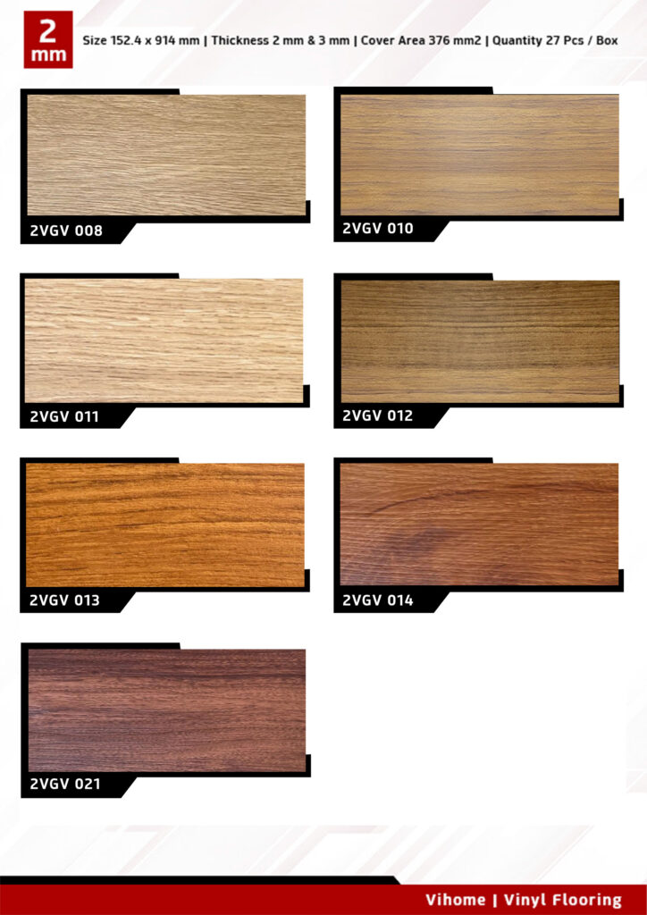 Wear Layer : 0,2 mm | Thickness : 2 mm & 3 mm Size : 152,4 mm x 914 mm | Cover Area : 3,76 m2 Quantity : 27 pcs